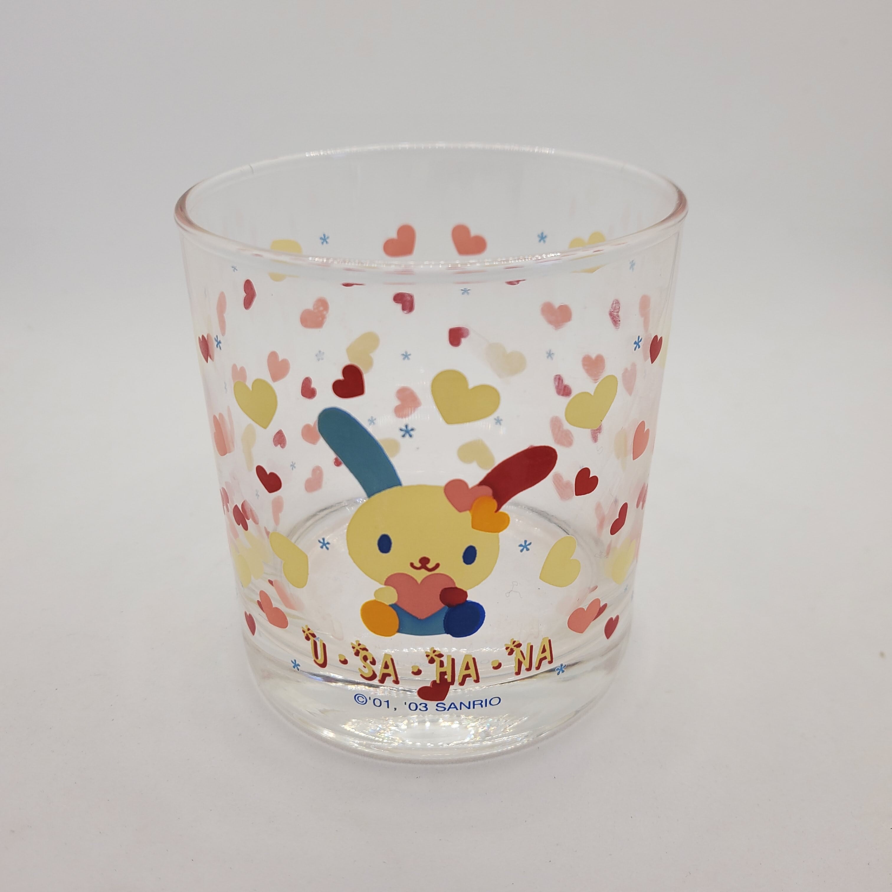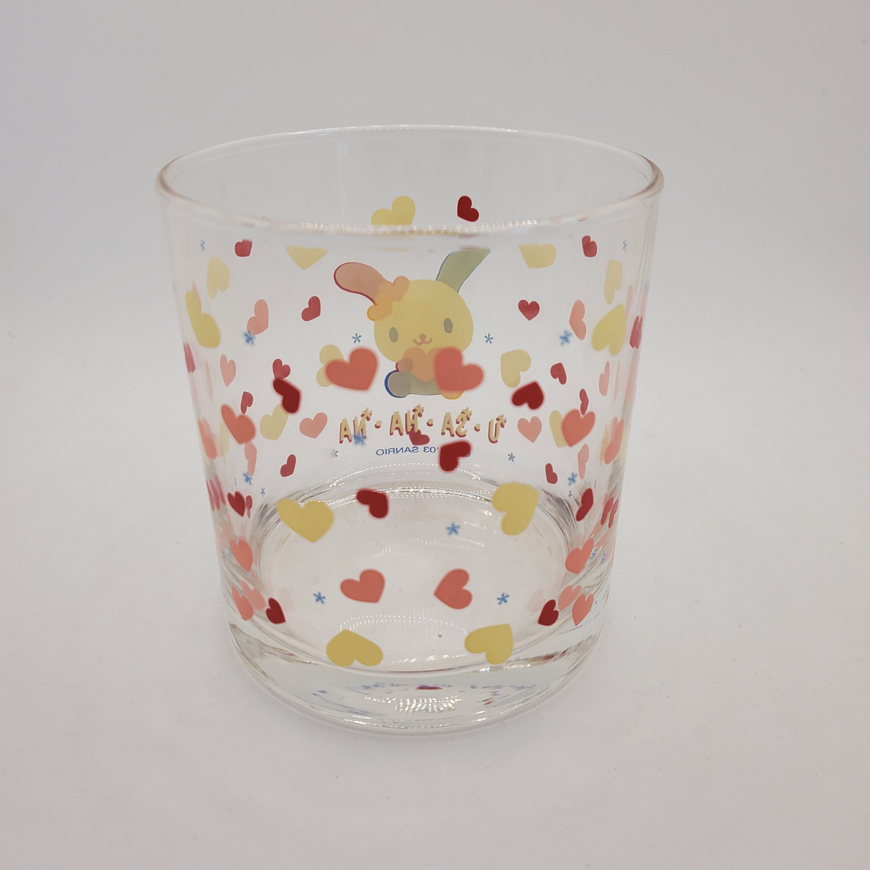 ハートがいっぱいちらばった ウサハナちゃんのかわいいグラスです♡ オトナっぽく、 焼酎やウィスキーのロックグラスとして 使用するのもアリですね♡ サイズ 高さ7.5センチ